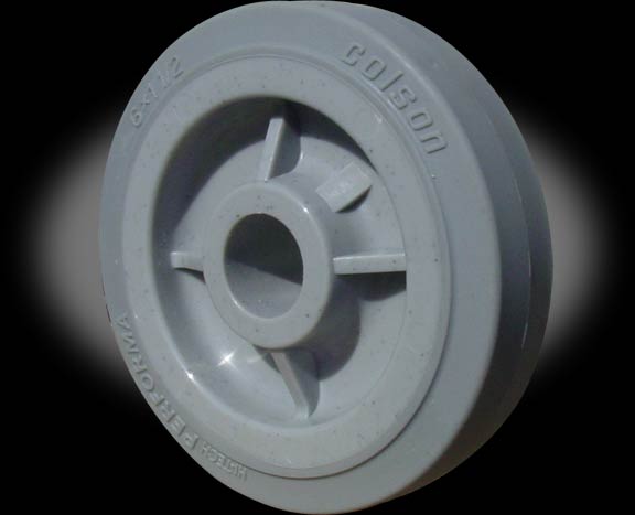 Performa wheels offer the advantages of both hard and soft tread materials in a single wheel. Like a hard tread wheel, Performa rolls easily and is very durable. Like a soft tread wheel, it rolls quietly, protects floors and resists impacts with a cushion ride. It also features maximum weatherability, low temperature flexibility, resistance to chemicals, water and steam, and rejects floor debris such as metal shavings. Non-marking thermoplastic elastomer tread is permanently bonded to durable polyolefin wheel core. The rubber is 65 ±5 Durometer Shore A scale.