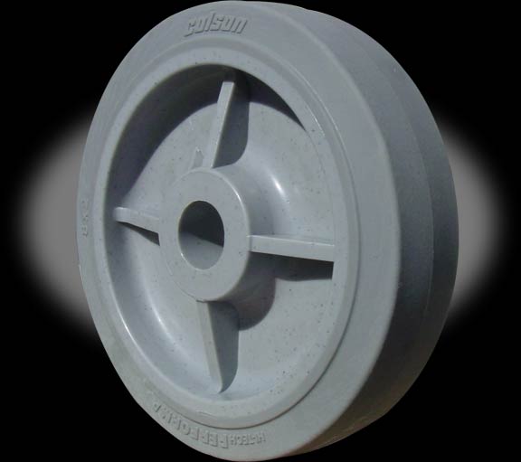 Performa wheels offer the advantages of both hard and soft tread materials in a single wheel. Like a hard tread wheel, Performa rolls easily and is very durable. Like a soft tread wheel, it rolls quietly, protects floors and resists impacts with a cushion ride. It also features maximum weatherability, low temperature flexibility, resistance to chemicals, water and steam, and rejects floor debris such as metal shavings. Non-marking thermoplastic elastomer tread is permanently bonded to durable polyolefin wheel core. The rubber is 65 ±5 Durometer Shore A scale.