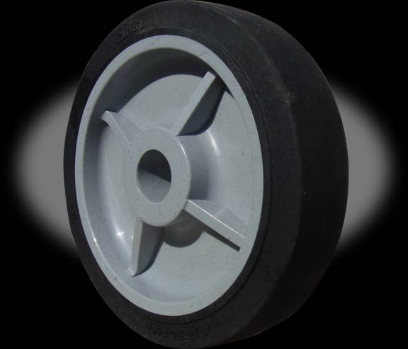 Performa wheels offer the advantages of both hard and soft tread materials in a single wheel. Like a hard tread wheel, Performa rolls easily and is very durable. Like a soft tread wheel, it rolls quietly, protects floors and resists impacts with a cushion ride. It also features maximum weatherability, low temperature flexibility, resistance to chemicals, water and steam, and rejects floor debris such as metal shavings. Non-marking thermoplastic elastomer tread is permanently bonded to durable polyolefin wheel core. The rubber is 65 ±5 Durometer Shore A scale.