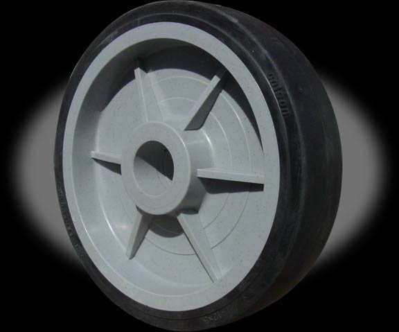 Performa wheels offer the advantages of both hard and soft tread materials in a single wheel. Like a hard tread wheel, Performa rolls easily and is very durable. Like a soft tread wheel, it rolls quietly, protects floors and resists impacts with a cushion ride. It also features maximum weatherability, low temperature flexibility, resistance to chemicals, water and steam, and rejects floor debris such as metal shavings. Non-marking thermoplastic elastomer tread is permanently bonded to durable polyolefin wheel core. The rubber is 65 ±5 Durometer Shore A scale.