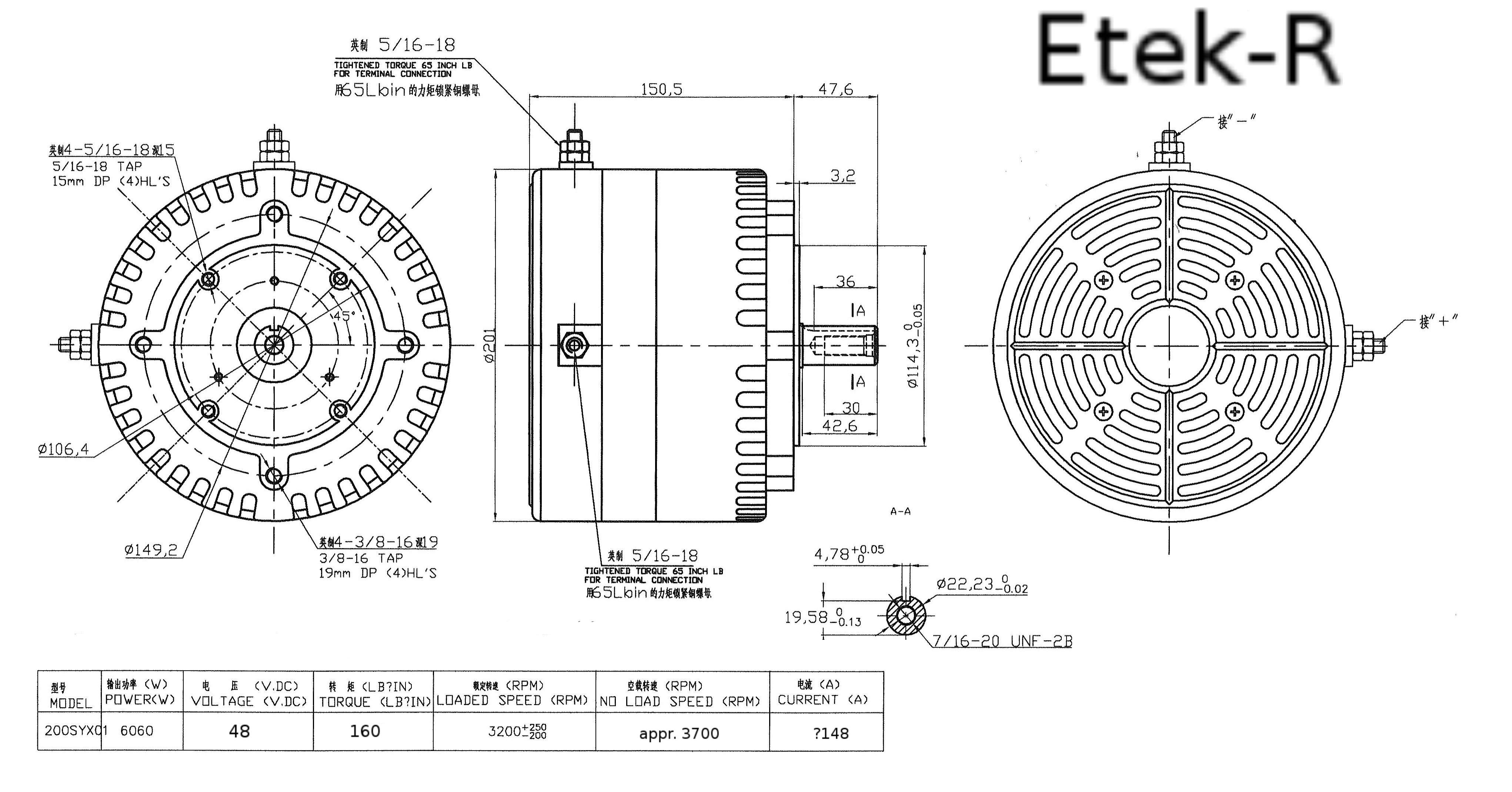 Slightly heavier than the original Briggs & Stratton Etek, this radial motor can do 150 amps at 48 volts continuous