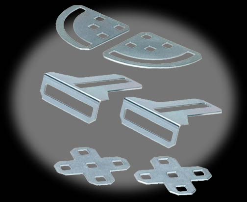 Bent gusset for strengthening "T" joints. Slots on both main flanges allow for adjustment on two axis. Can also be used as a motor mount.