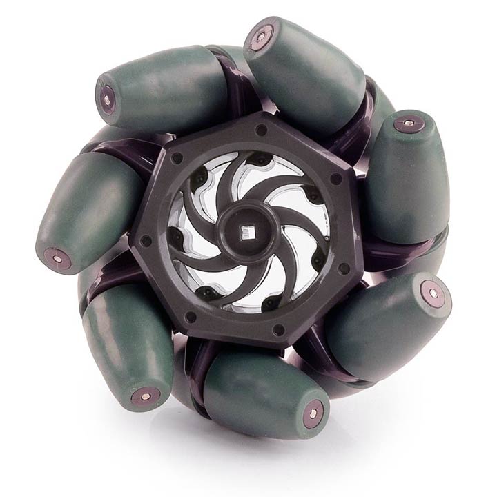 Mecanum wheels allow savvy robot designers to create drivetrains capable of moving in any direction using a standard chassis shape. Simply power each wheel with a different motor and by changing the directions the wheels spin get your robot to move in different directions! Includes two left and two right wheels.