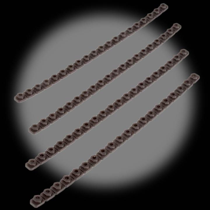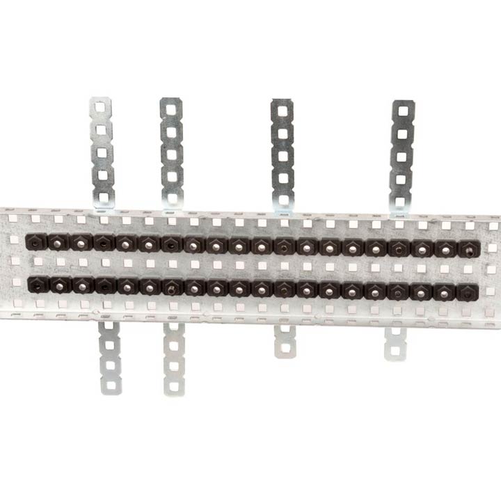 The Nut Bar consists of a plastic piece with 20-holes sized such that VEX 8-32 screws will self-tap into them. By mounting these bars onto VEX structural metal, you create a series of holes which can be used as nuts. This allows a set of holes that can be mounted to without having access to the back side of the plate.