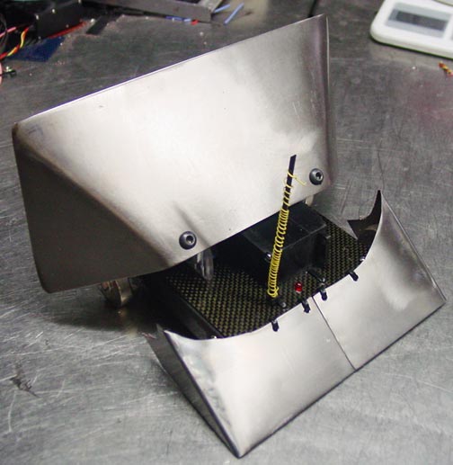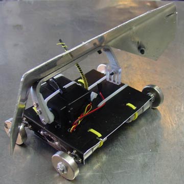 Range of motion of the servo-powered lifting plow. It doesn't go all the way around like on Shazbot, but it certainly does lift pretty high. Enough height to lift many other bots out of the arena.